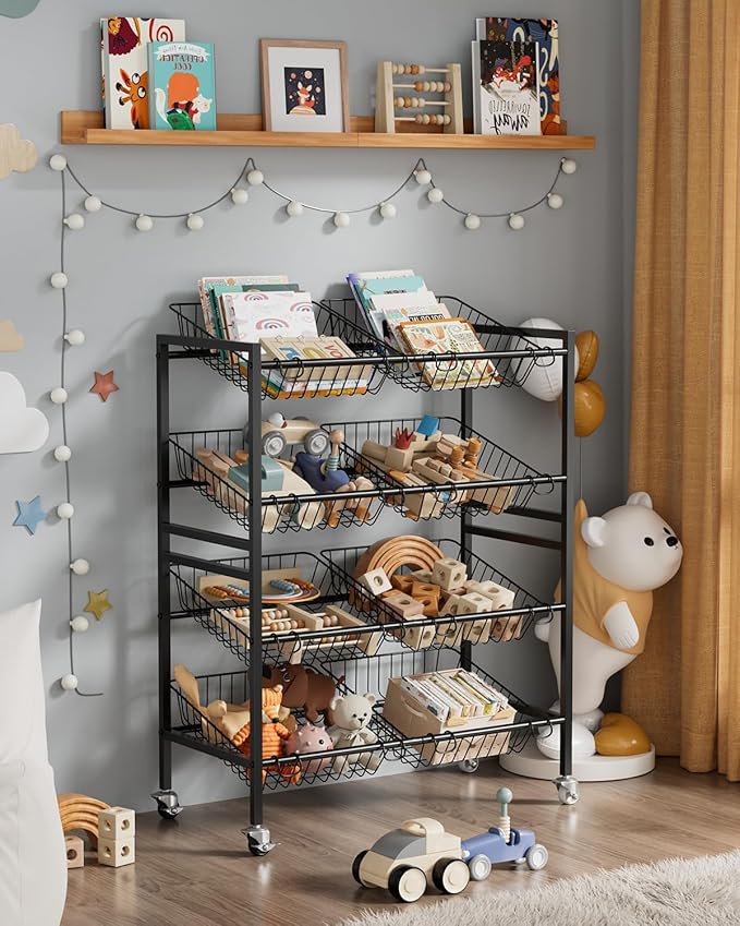 25.2''W Kitchen Storage Cart, Rolling Snack Cart, 4 Tier Fruit Basket Stand, Metal Pantry Storage with 8 Stackable Wire Baskets, Black