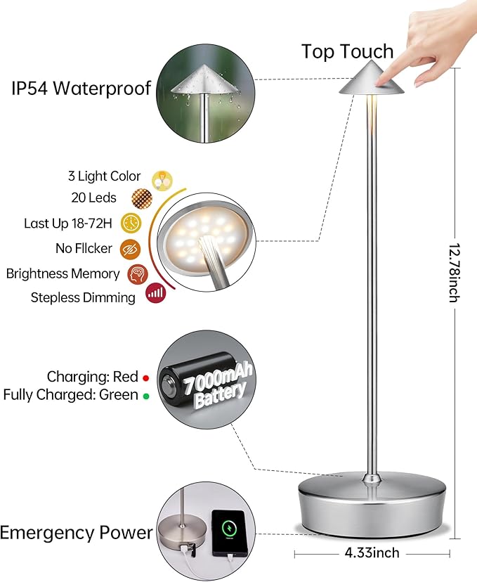 - 【Cordless Table Lamp Rechargeable】As adopt a safe and durable 7000mAh rechargeable lithium-ion battery, it can be used up to 18-72 hours as long as fully charged with 3-3.5 hours in advance. You can easily charge the battery by using the attached USB-C cable, The red light is flashing when it is charging; the green light is always on when it is fully charged.