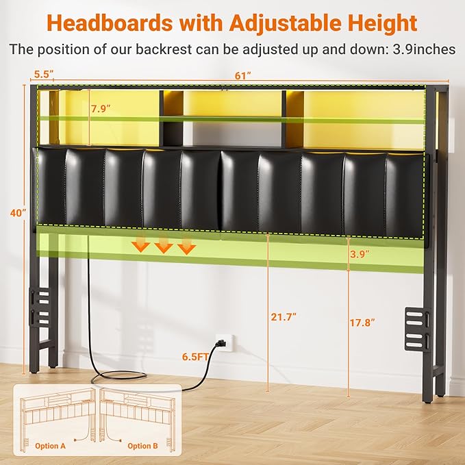 Aheaplus Headboard for Queen Size Bed with Storage, Upholstered Headboards with Outlets, USB Ports and LED Light, Reversible Queen Size Head Board, Height Adjustable, Comfortable Headboard, Black