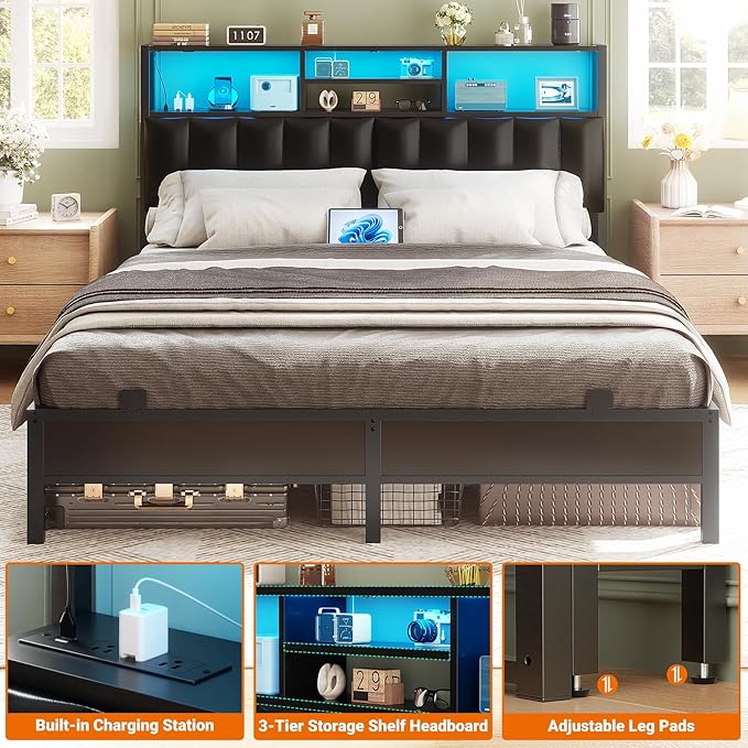 - 【Soft Upholstered Backrest and 3-Tier Shelf】Upholstered headboard is filled with high-density sponge, giving you the most comfortable and soft back support. The queen headboard also has 3-tier storage shelves for storing books, phones, a clock, or some private stuffs, which is convenient and practical. creating a clean and comfortable sleeping environment. The leather backrest is soft, comfortable, and easy to clean.