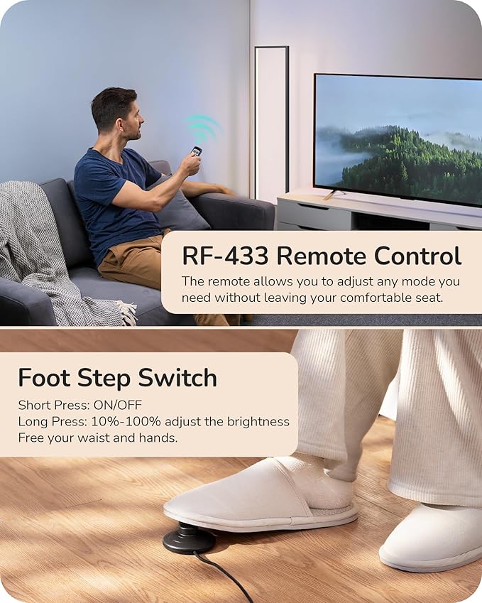 - [8-Key Remote & Foot Switch] The included RF-433 remote control lets you operate the dimmable floor lamp from up to 49 feet, giving you flexibility in any room; foot switch allows for effortless brightness and color adjustments, no bending bow, and no hands needed