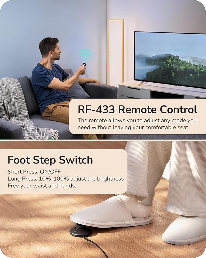 - [8-Key Remote & Foot Switch] The included RF-433 remote control lets you operate the dimmable floor lamp from up to 49 feet, giving you flexibility in any room; foot switch allows for effortless brightness and color adjustments, no bending bow, and no hands needed