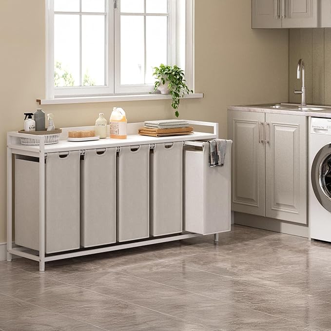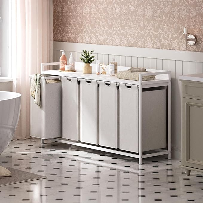 Laundry Hamper with Shelf, Laundry Basket 5 Section, Laundry Sorter with Pull-Out Removable Large Bags and Movable Wheels, Metal Frame, 5 x 15.87 Gallons (60L), White PF08XLW