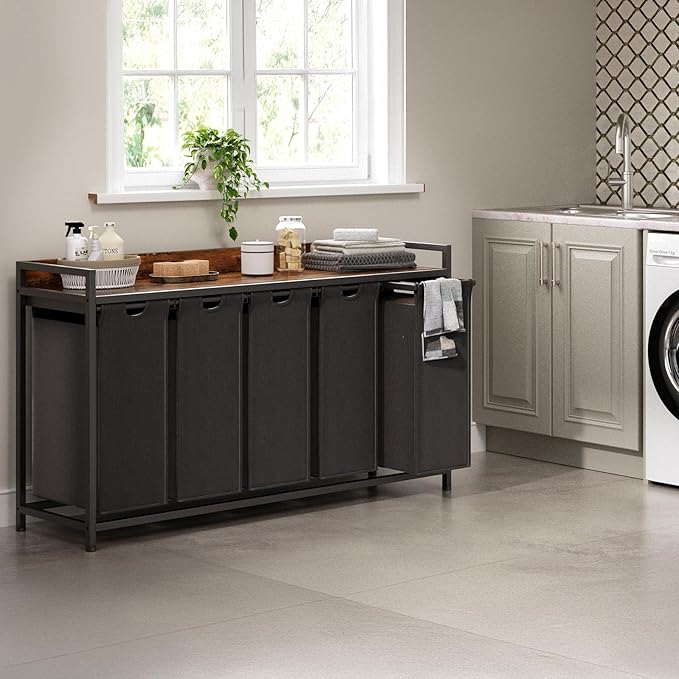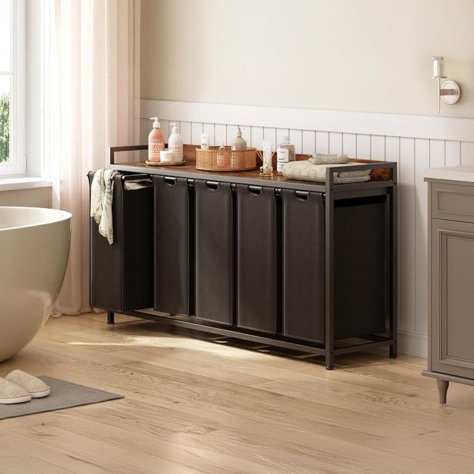 Laundry Hamper with Shelf, Laundry Basket 5 Section, Laundry Sorter with Pull-Out Removable Large Bags and Movable Wheels, Metal Frame, 5 x 15.87 Gallons (60L), Rustic Brown + Blck PF08XLY
