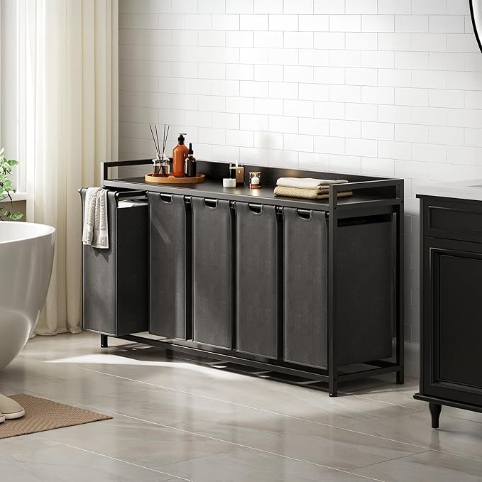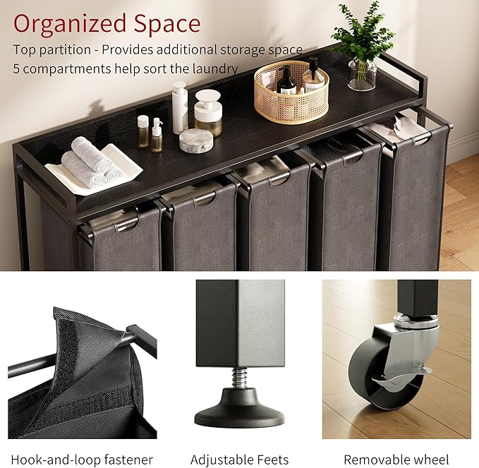 Laundry Hamper with Shelf, Laundry Basket 5 Section, Laundry Sorter with Pull-Out Removable Large Bags and Movable Wheels, Metal Frame, 5 x 15.87 Gallons (60L), Black PF08XLB