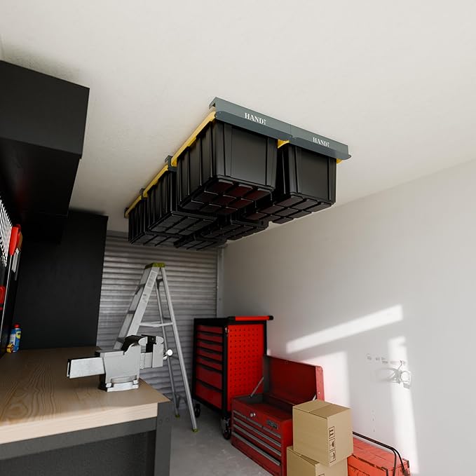 - UNLOCK MORE STORAGE - The double rail ceiling shelf design also allows you to unlock another row of overhead storage. The tote storage rack is the perfect garage hanging storage racks for more garage shelf space since the tote rack is customizable to fit your overhead storage space needs