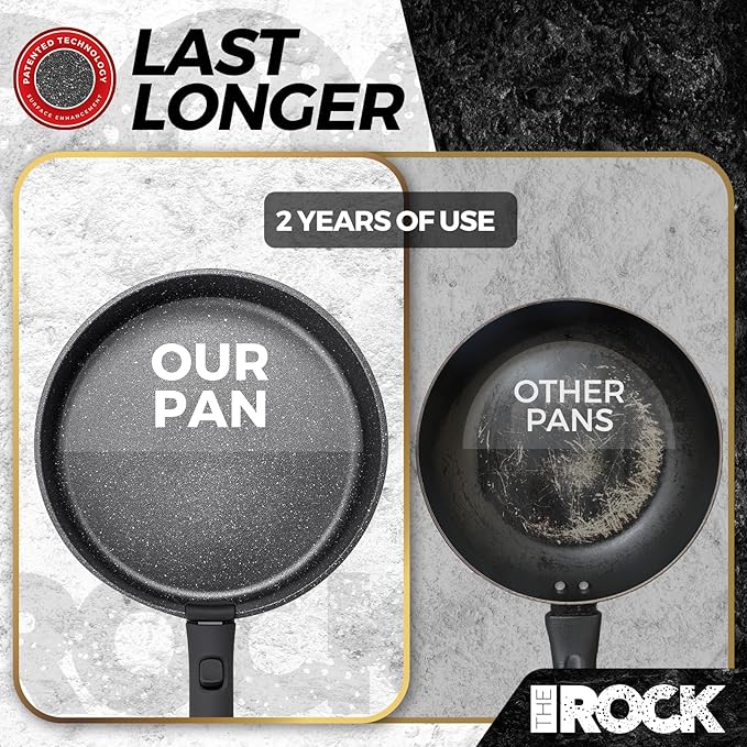 - 3x More Durable: The Patented Rock.Tec manufacturing process strengthens the surface of the cookware creating an ultra-hard, rock-like surface. The result is an outstanding release performance, 3x better than the standard non-stick cookware