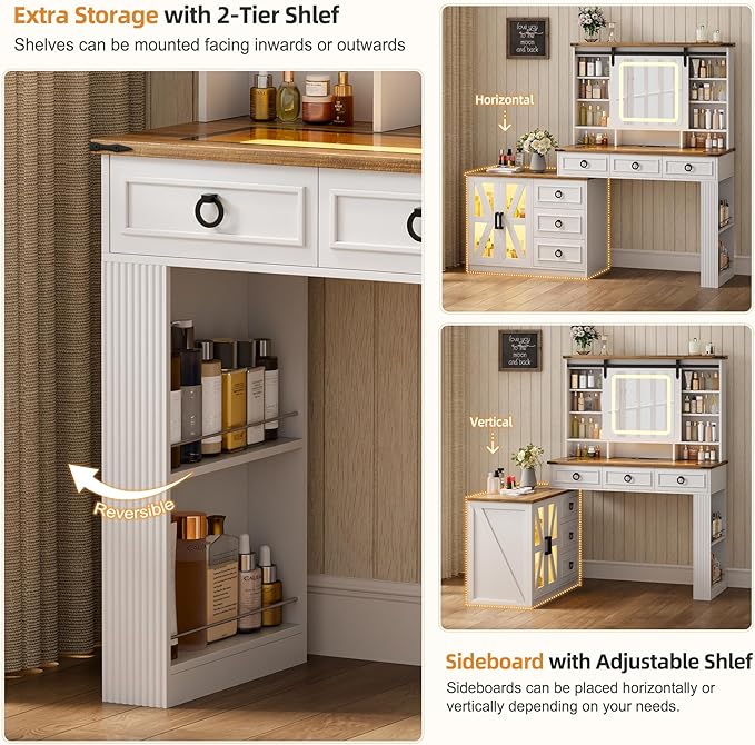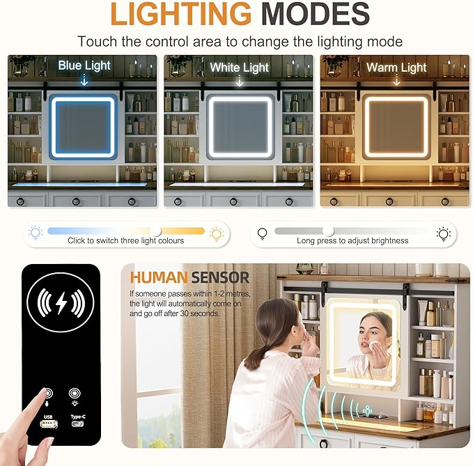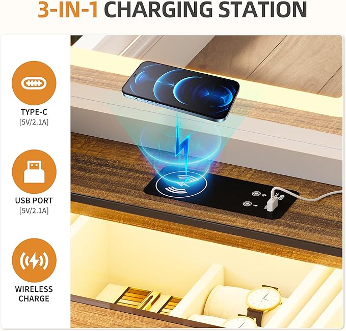 - 【Convenient Charging Station】The LED dressing table comes with wireless charging station and 1 USB port and 1 TYPE-C port. When you're doing makeup/work and notice that your phone is out of battery, you can use the wireless charger to charge your phone for quick charging