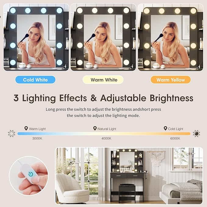 - 【3 Colors Lights with Brightness Adjustable】The vanity with mirror is surrounded by 10 Hollywood light bulbs with 3 color modes (warm/natural/cool) and adjustable brightness, providing a well-lit and clear reflection for easy makeup application or grooming.Suitable for live broadcast, video recording, salon and other activities.