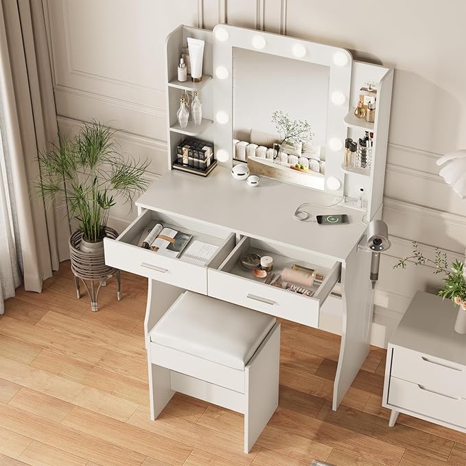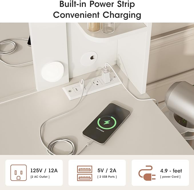 - 【Makeup Desk with Charging Station】This vanity with lights has a embedded power strip, including 2 standard plug sockets and 2 USB ports, which can be more convenient to connect your hair dryera and curling iron at any time, and it can also charge your phone, tablet, or other mobile devices.