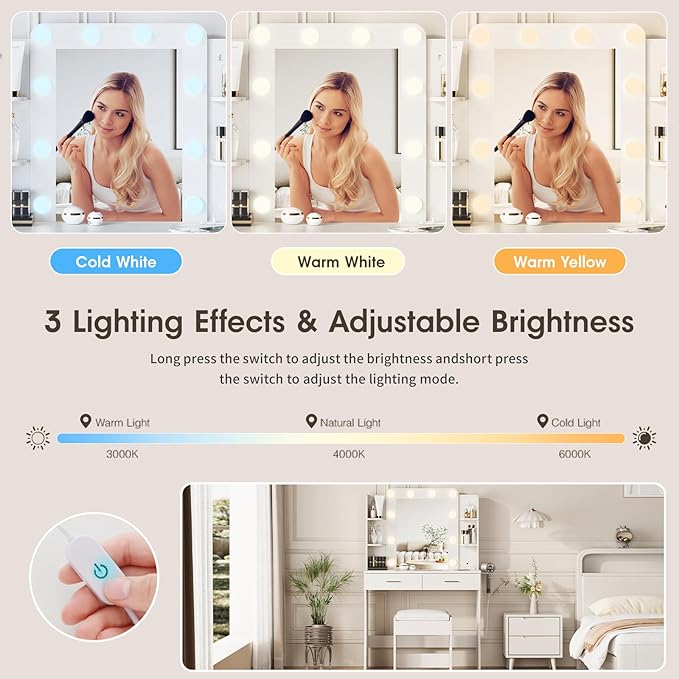 - 【3 Colors Lights with Brightness Adjustable】The vanity with mirror is surrounded by 10 Hollywood light bulbs with 3 color modes (warm/natural/cool) and adjustable brightness, providing a well-lit and clear reflection for easy makeup application or grooming.Suitable for live broadcast, video recording, salon and other activities.