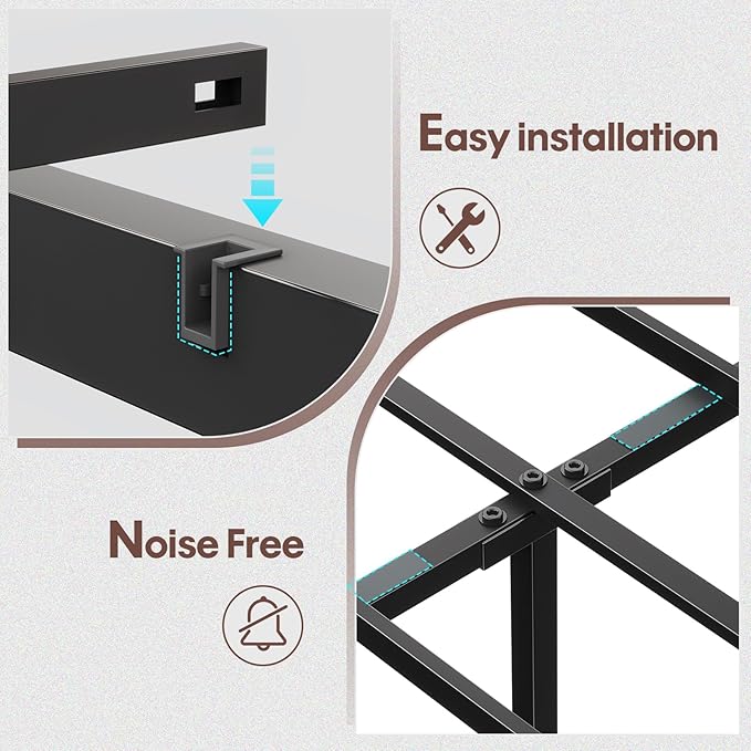 - 【No Box Spring Needed & Noise Free】 12 thickened Metal Flat Slats System and Headboard Support Legs of Black Metal Bed Frame offers a strong Support up to 1000 lbs. Meanwhile, we specially added a Silent Sponge Strip on the middle Beam to avoid Friction between Metal Parts and provide you with a Noise Free Resting Environment. No Box Spring needed