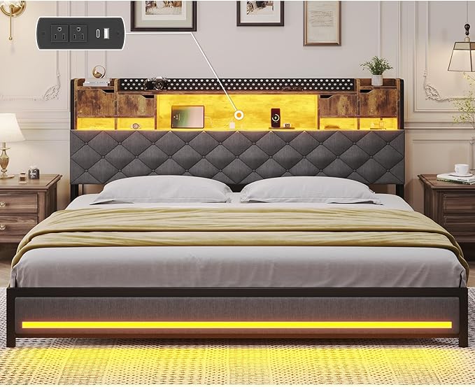King Size Bed Frame with Upholstered Storage Headboard, King Bed Frame with Smart LED Lights, Camas King Bed with Charging Station,Noise-Free, Metal Support, No Box Spring Needed, Gray
