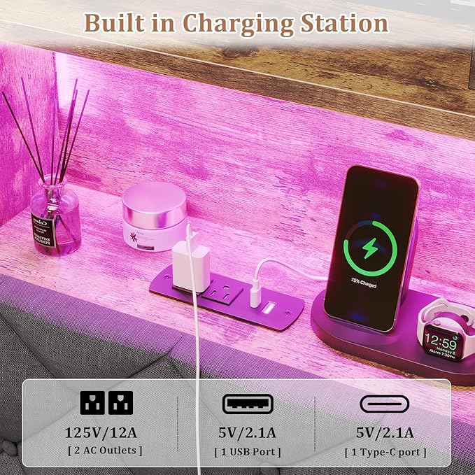 Queen Bed Frame with 4 Drawers and Hidden Storage Headboard,LED Bed Frame with Marshmallow Storage and Charging Station,Light up Queen Platform Bed,No Box Spring Needed, Easy Assembly,Vintage Brown