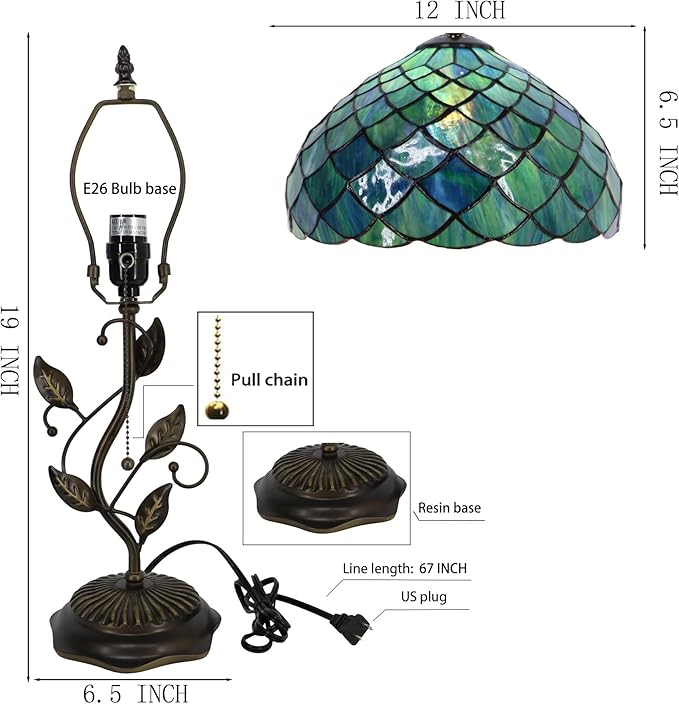 - Versatile Lighting: This Tiffany-style table lamp features a 12-inch shade diameter and stands 19 inches tall Resin base with iron metal leaves finished bronze, simple assembly.