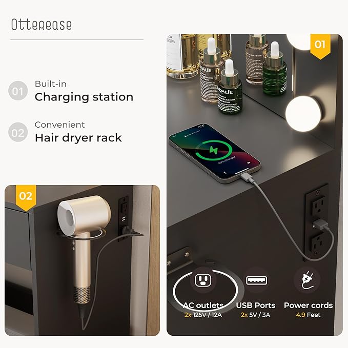 - 【Unique Functional Design】The vanity table is equipped with a hair dryer holder, so you can use the hair dryer at any time. The charging station of the dressing table has 2 standard sockets and 2 USB ports, which is convenient for you to use the hair dryer or curling iron, and you can also charge other mobile devices.
