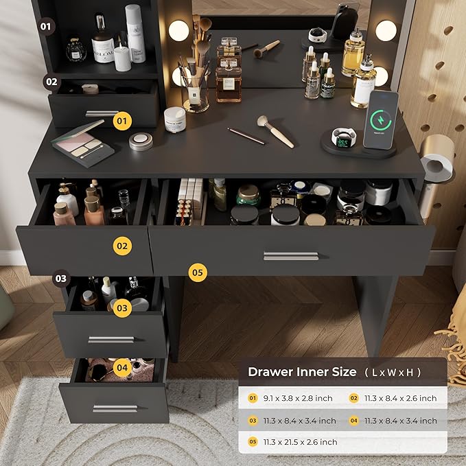 Vanity Desk with LED Lighted Mirror&Power Outlet, 3 Lighting Colors Makeup Vanity Desk with 5 Large Drawers and 3 Storage Shelves, Black Vanity Dresser with Storage Stool for Bedroom