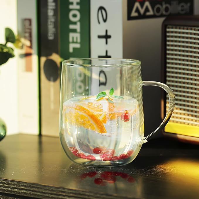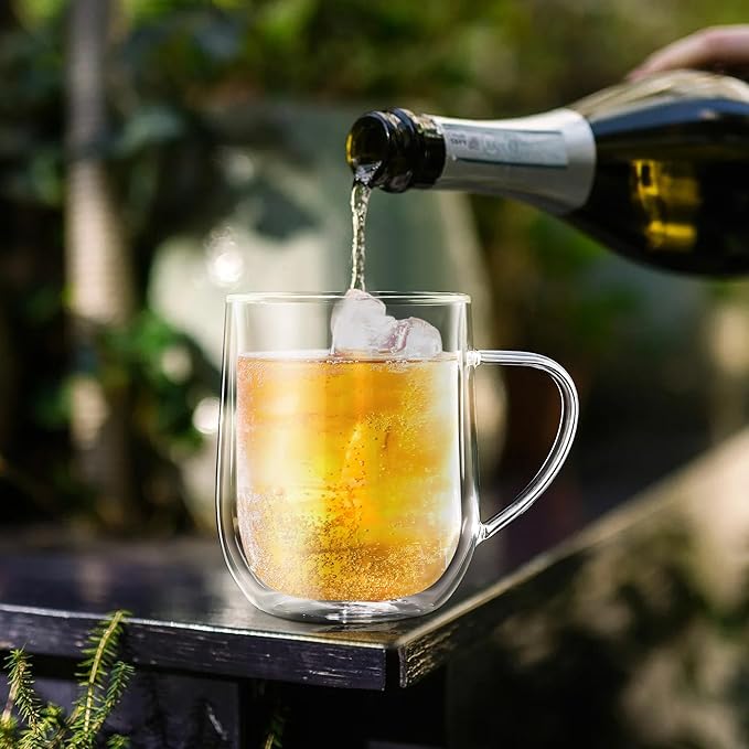 - Double Layer Design With Handle: The double insulated with handle design keeps drinks hot or cold for longer than traditional glasses, keeps the outside of the glass mugs from burning when you hold it and move it around, and prevents condensation on iced drinks. From a distance your drink appears to float in mid-air, making it a great visual experience!