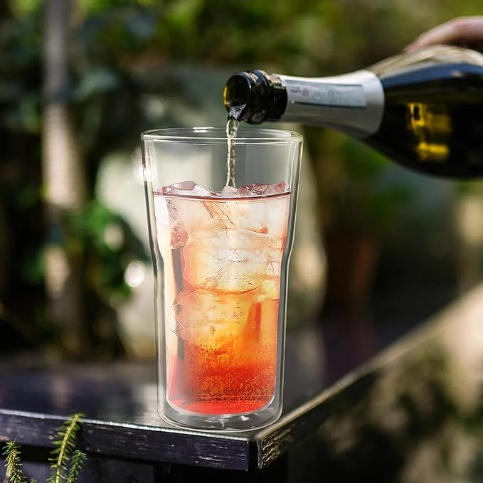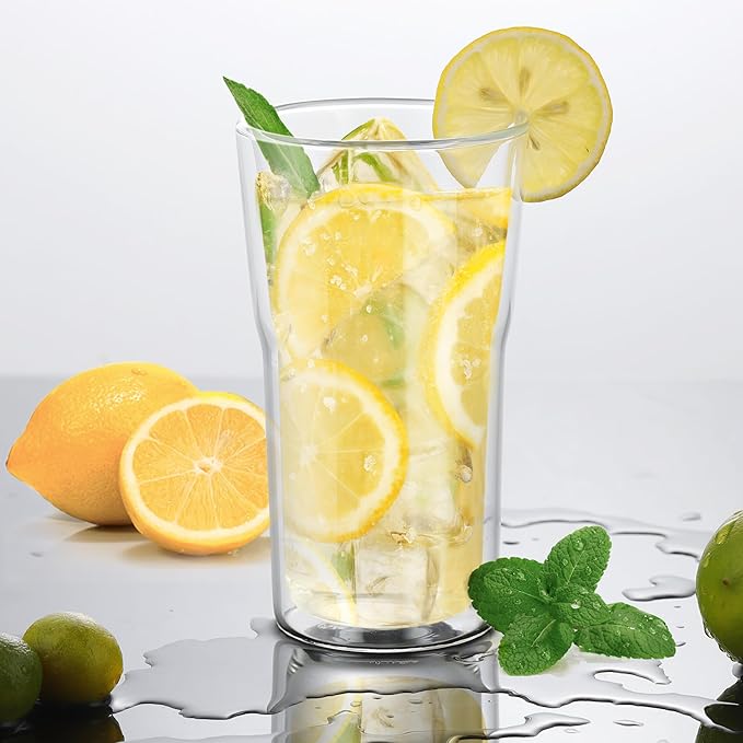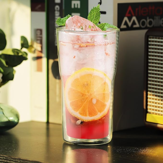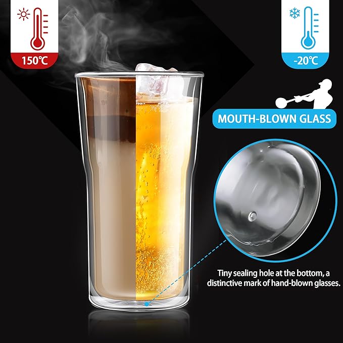 Joeyan Glass Double Walled Beer Drinking Glasses Tumbler 16 oz, Double Layer Tall Borosilicate Insulated Water Cocktail Glass Cups, Double Lined Thermo Tea Coffee Hot Beverage Glassware, Set of 2
