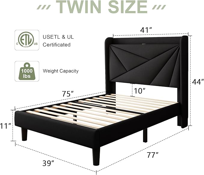 Feonase Twin Size Bed Frame with Charging Station, Upholstered Linen Platform Bed Frame with Wingback Headboard, Solid Wood Slats Support, No Box Spring Needed, Noise Free, Black