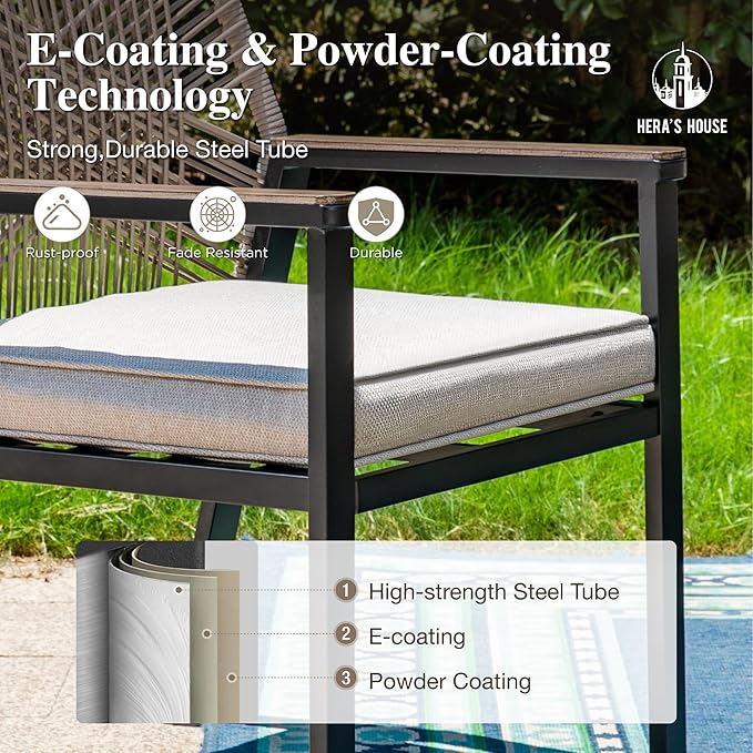 - 【PRACTICAL PATIO SET】Including 1 x 59" metal patio table, 6 x patio dining chairs with rattan chair backs and cushions. Our outdoor table chairs are produced by high-performance E-Coated& Powder-Coated Steel to provide extended protection against rust, scratches, rain, and UV harm for long-term outdoors. Ideally suited for business use, everyday use or your leisure time with your friends or family