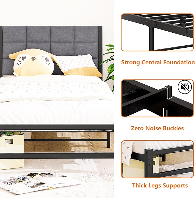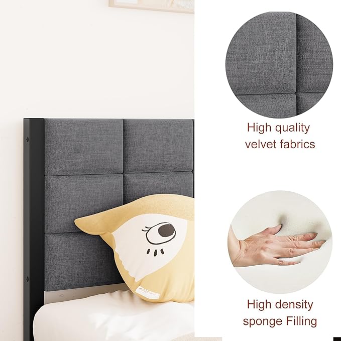 Twin Bed Frame Upholstered Platform Bed Frame with Headboard,Metal Bed Frame Twin Size with Metal Slats Support,No Box Spring Needed/Under Bed Storage/Easy Assembly,Noise Free,Grey