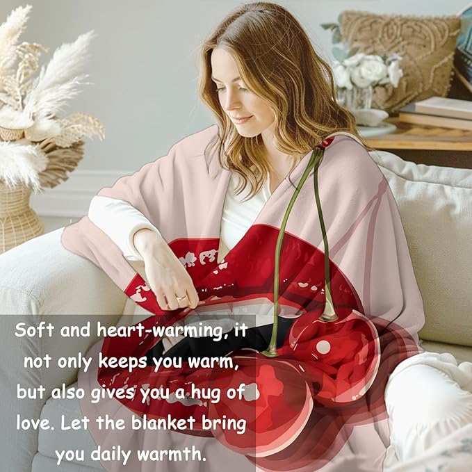 Cherry Lips Flannel Blanket, Pop Art Cherry Gifts, Cherry Blanket for Women, Soft Lightweight Throw Blankets for Bed Home Travel Decor 50" x 60"