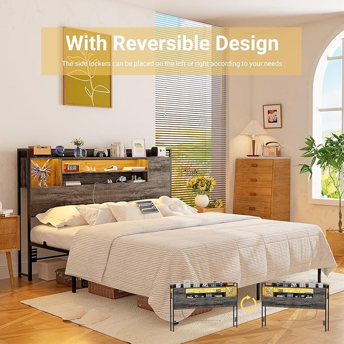 - 【Ample & Flexible Storage Space】The queen size storage bookcase headboard includes one shelf and four storage spaces of varying sizes for storing cell phones, alarm clocks, books, and some other personal belongings to keep your room looking organized, creating a clean and comfortable sleeping environment. Additionally, You can customize the side storage to be on the left or right side as needed.