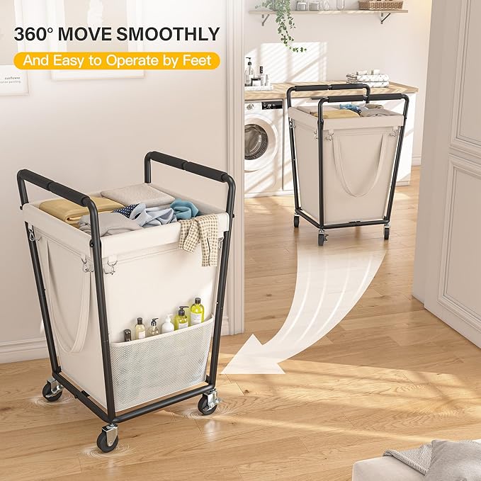 Laundry Basket with Wheels & Handles, 180L Laundry Cart with Removable Bag & Metal Frame for Clothes Storage, Laundry Room Organization Rolling Hamper with Wheels For Laundry, Dorm (Beige)