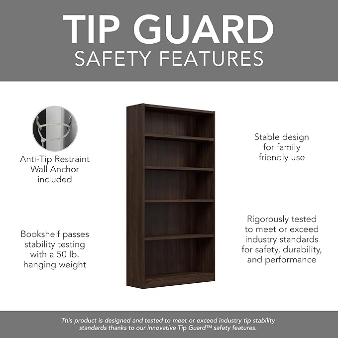 Bush Furniture Universal Tall 5 Shelf Bookcase in Black Walnut, Vertical Storage and Display Bookshelf for Home Office or Living Room Organization