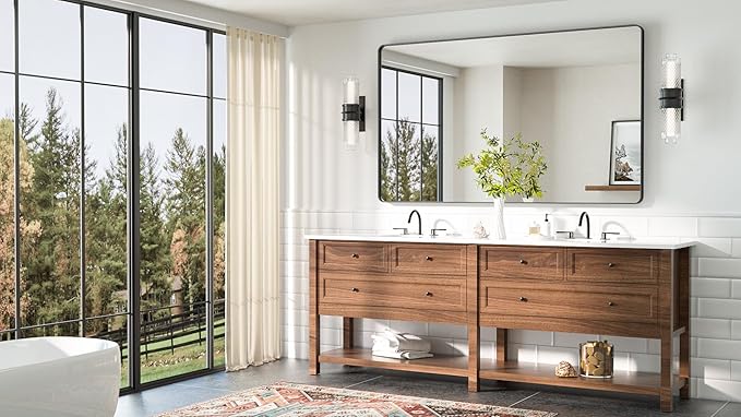 - 【Timeless Design with a Modern Touch】The combination of rounded corners and a floating mirror in this design perfectly marries classic elements with contemporary style. This thoughtful construction not only enhances tactile comfort but also creates a sense of visual expansiveness, while the integrated frame of this bathroom vanity mirror elevates the overall aesthetic appeal.