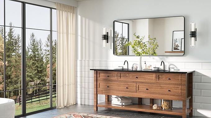 - 【Timeless Design with a Modern Touch】The combination of rounded corners and a floating mirror in this design perfectly marries classic elements with contemporary style. This thoughtful construction not only enhances tactile comfort but also creates a sense of visual expansiveness, while the integrated frame of this bathroom vanity mirror elevates the overall aesthetic appeal.