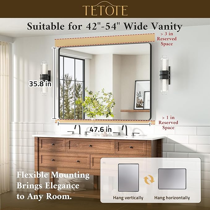 TETOTE 48 x 36 Black Mirror Large Matte Black Bathroom Mirror, Tempered Glass, Wall Mounted for Bathroom, Entryway, Bedroom, Living Room(Horizontal/Vertical)