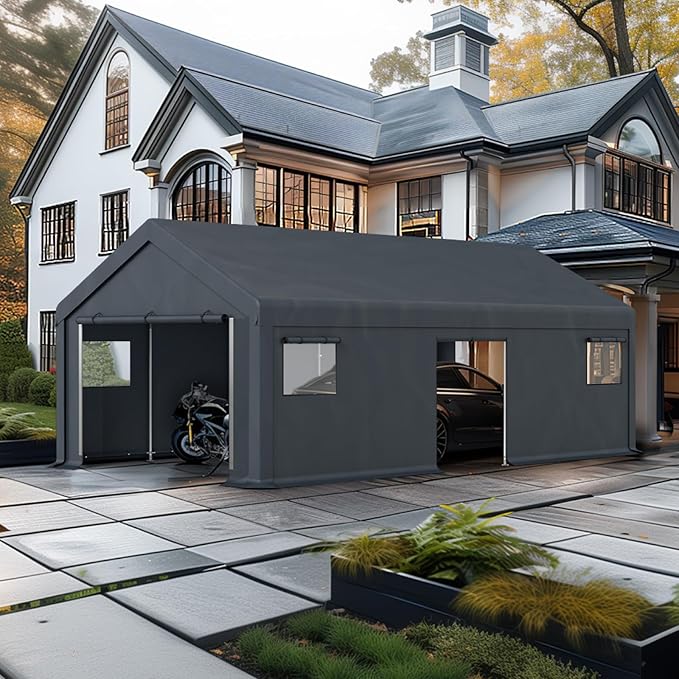 - 【Effortless Setup & Versatility】Clear step-by-step instructions guide you through the process, and with two or more adults, you can have it set up within just 1 hour. Beyond car coverage, this versatile shelter is ideal for parties, fairs, and birthdays, or storing various items like boats, trucks, lawn and garden equipment, and more. The sidewalls of the carport garage can be detached.