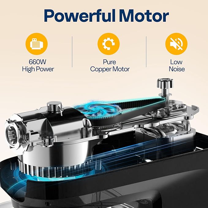 - ALL-IN-ONE 9-IN-1 STAND MIXER: This multifunctional mixer with a 660 W motor offers nine functions including mixing, kneading, grinding, juicing, and more; It also includes a wide range of accessories such as a dough hook for kneading flour, a beater for mixing butter, and a whisk for whipping cream; Additionally, a blender for drinks, a meat grinder for fresh ground meat, noodle and cookie attachments, and vegetable slicer accessories offer even more versatility; Perfect for holiday meals, family gatherings, and picnics