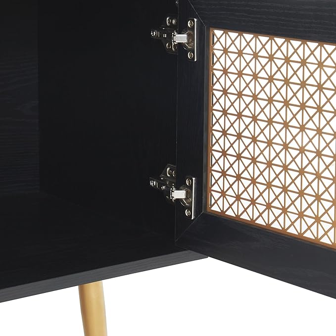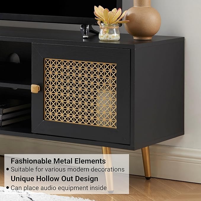 - Mid-century Style TV Stand: The perfect fusion of wooden appearance and golden metal mesh door endows this TV stand with a unique medieval Bohemian aesthetic, effortlessly enhancing its elegance.