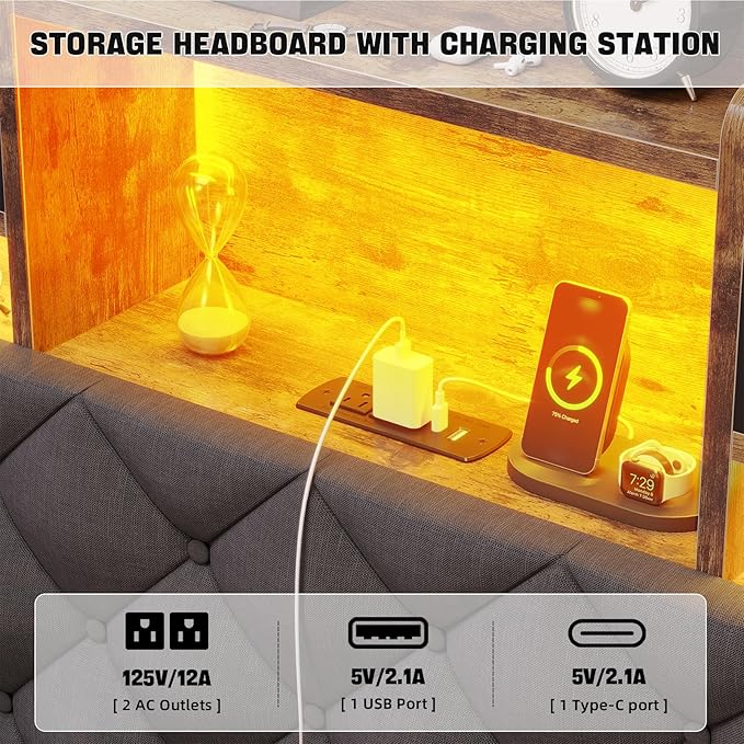 - 【LED Bed Frame with Charging Station】The built-in power strip on the headboard includes 2 outlets, 1 USB port and 1 Type-C, which is very convenient for you to charge your mobile phone, tablet, headphones or other electronic devices. The design ensures that your devices are always within reach. The headboard of the bed frame is equipped with RGB lights, which can be controlled by mobile phone APP or remote control. You can set the brightness and color freely