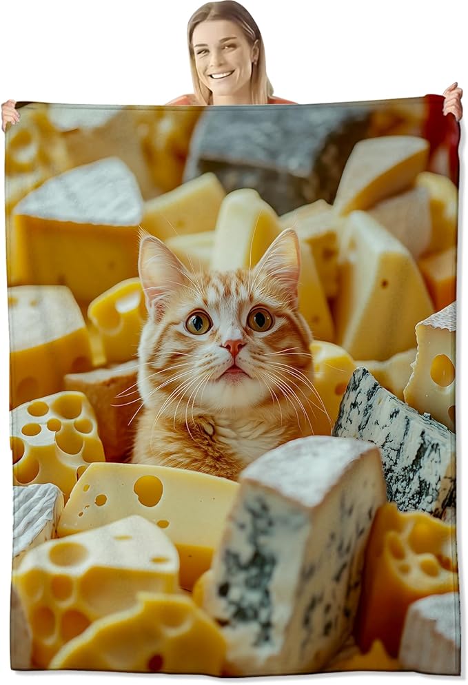 Adorable Cheese Cat Flannel Throw Blanket 50x60 Inch, Cute Orange Kitten Throws, Whimsical Food Humor Fleece Blankets for Couch, Bed, Sofa, Travel, Pet Lovers Novelty Gifts Decor