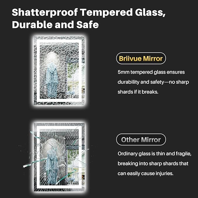 - [Shatterproof & Durable]: Made with tempered glass, this led mirror for bathroom is shatter-resistant and safe. Even if broken, it won’t create sharp pieces. The corrosion-resistant epoxy coating ensures long-lasting use.