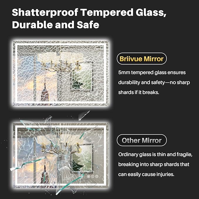 - [Shatterproof & Durable]: Made with tempered glass, this led mirror for bathroom is shatter-resistant and safe. Even if broken, it won’t create sharp pieces. The corrosion-resistant epoxy coating ensures long-lasting use.