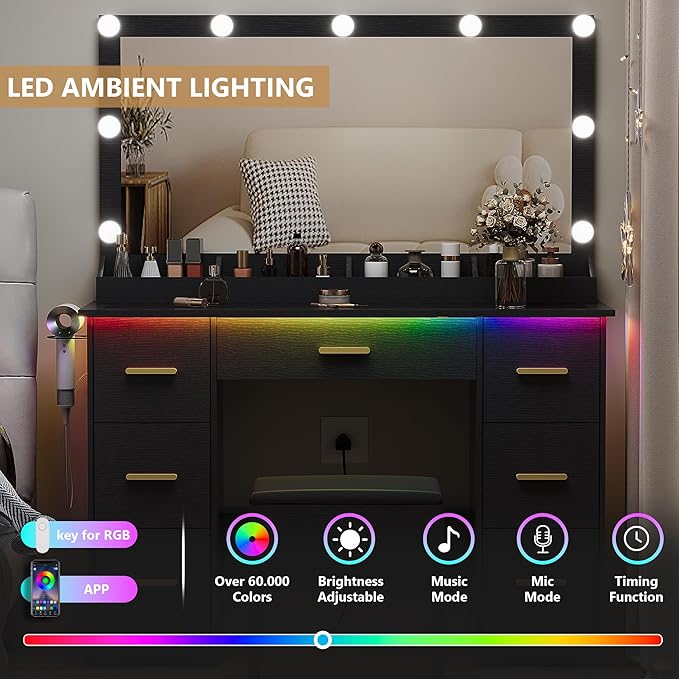 - 【MULTI LIGHTING&BRIGHTNESS ADJUSTABLE】The vanity desk with mirror and lights comes with 3 color modes, you can adjust different modes to suit your needed- natural white, warm white, cool white. The LED lights under makeup desk top have more than 1,000 transformation modes and color changes, which it can controlled via APP or the switch to create a beautiful ambiance, providing the perfect atmosphere for your makeup.