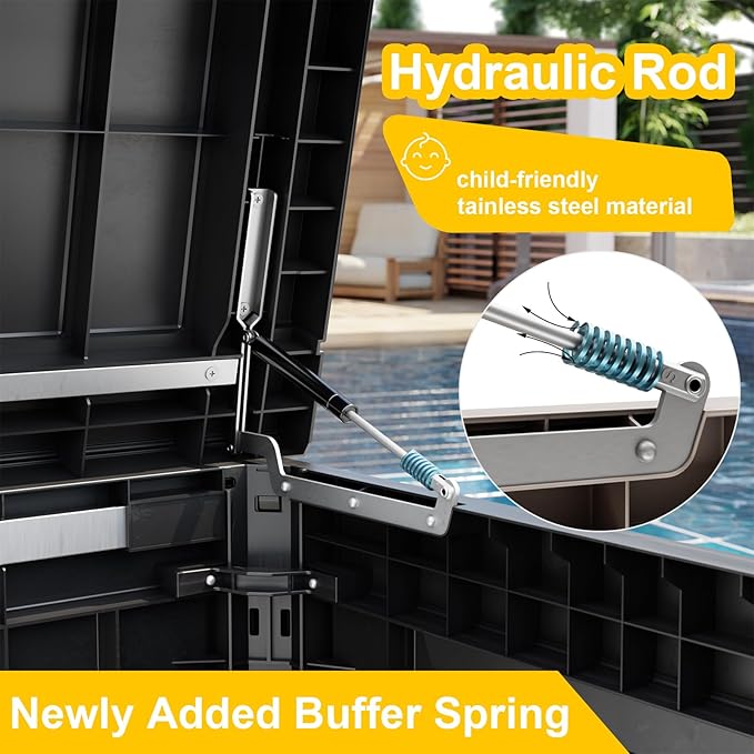 - Safety design: Each deck box has lockable holes (not included) for added security; in addition, the box is equipped with a hydraulic stand, which allows easy opening and slow closing and prevents hand pinching. The outdoor waterproof deck box has built-in handles on both sides, ensuring easy grabbing and moving