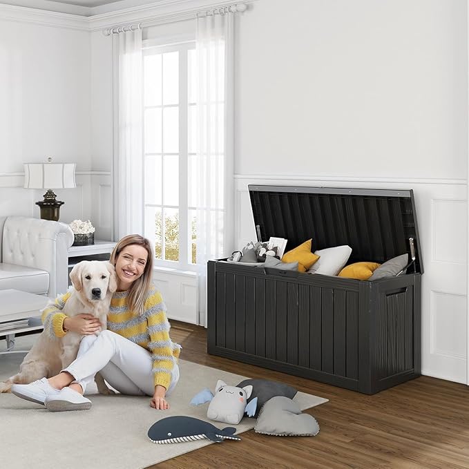 - VERSATILE IN EVERY SETTING: This patio storage box doubles as an indoor laundry organizer and an outdoor yard storage unit for cushions, garden tools, pool accessories, outdoor gear, and more, offering ample space. It can also serve as a side table, patio seat, storage bench, or footstool