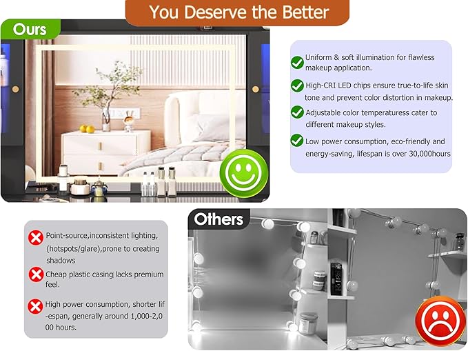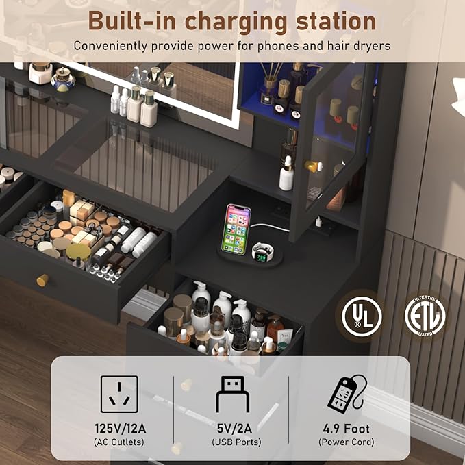 - Vanity Desk with 60,000-color LED RGB Cabinets: Our led vanity come with 2 RGB clear tempered glass cabinets which has 60,000 color led lights and multiple lighting modes, like timing function, music sync, mic sync,tec. for choose, you can control it via APP or RF switch. Provide you a stunning visual and immersive experience while you relax or entertain.