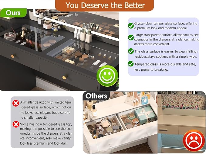 - Large Glass Desktop:The Tempered glass desktop design can not only clearly view of the items stored in the drawer, no longer need to worry about finding the items, but also make the vanity looks more expensive and advanced.