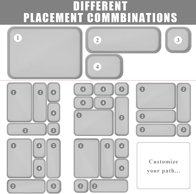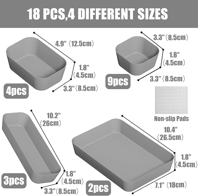 - 【Multiple Sizes】 18pcs customizable drawer bins includes 4 sizes: 3.3" x 3.3" x 1.8" (9 pcs), 4.9" x 3.3" x 1.8" (4 pcs), 10.2" x 3.3" x 1.8" (3 pcs), 10.4" x 7.1" x 1.8" (2 pcs), you can customize the combinations, It’s easy to find a configuration that works for your drawers or desktop.