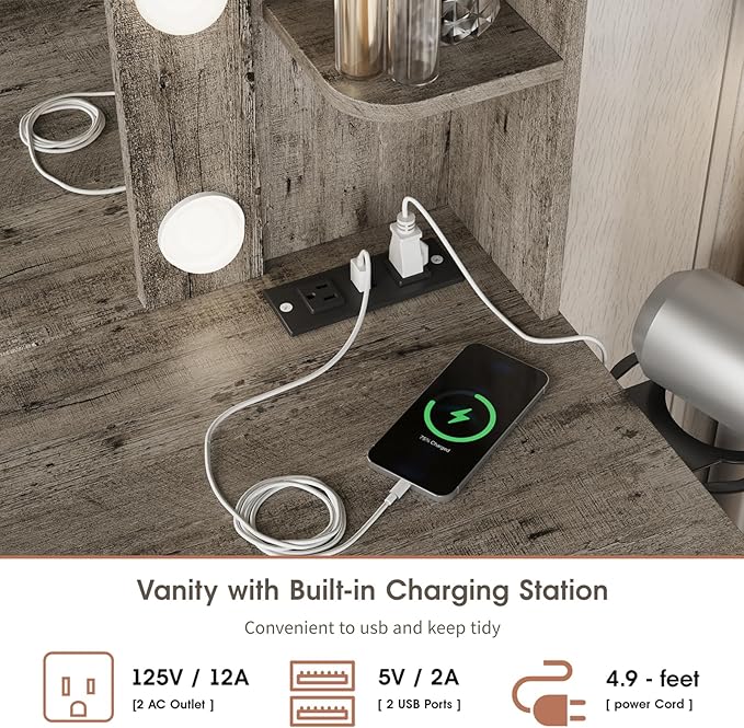 - 3 color temperature LED lights can be switched, you can change the color or brightness according to any scene or makeup needs, which allows you to better control the lighting and room atmosphere and helps you create the best makeup look every day. There is a built-in charging board on the desktop, which does not take up much space and is convenient for using hair curlers, hair dryers, beauty instruments, mobile phone charging.