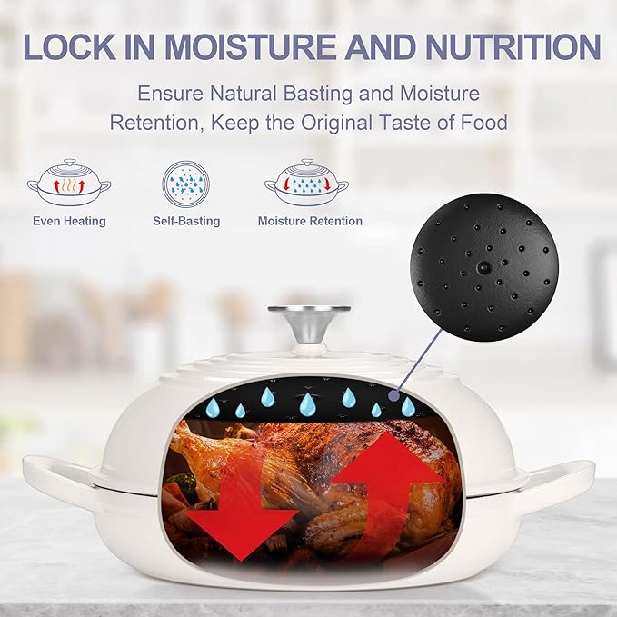 - Self-Basting Dome Lid: The cast iron dutch oven is features a tight-fitting lid to lock in nutrients, The optimal size and dome shape provides sufficient space for the bread dough to expand during the baking process, The self-basting design on lid traps and evenly circulates steam, Maximum rise, Resulting in a crisp signature golden-brown crust and exceptional flavor