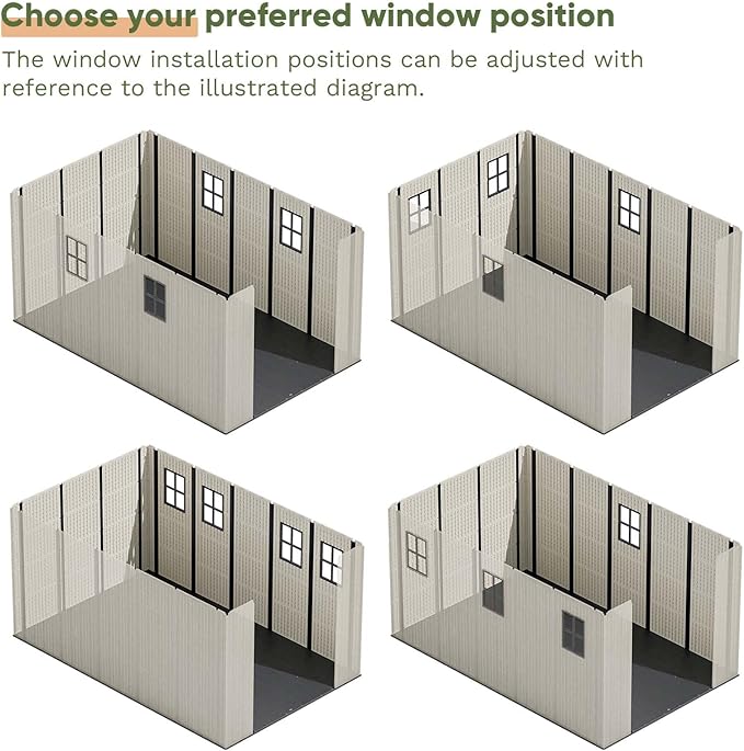 - Window design: Two window designs lets in natural light, reducing the need for extra lighting;Provides a pleasant view;Offers added security with a view of the shed's contents. And the position of the window can be adjusted according to your needs with the wall panel.