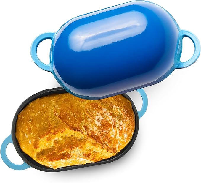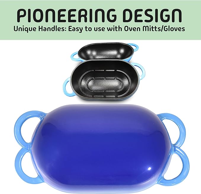 - PIONEERING DESIGN : LoafNest Dutch Oven is made specifically for Breadmaking. Unique Handles are Easy to Use with Oven Mitts/Gloves. Unique Oblong Shape prevents the Dough from Spreading and creates a loaf that is Ideal for Sandwiches. Enameled for lasting Beauty and Ease of Cleaning.